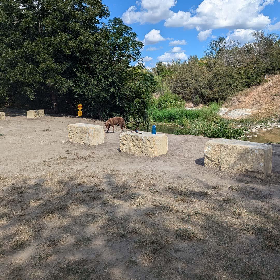 The Onion Creek Dog Park is a popular off-leash area located within Onion Creek Greenbelt in southeast Austin. The area is prone to flooding and therefore cannot have standard park amenities like benches, leaving dog owners and park users to create temporary seating with chairs brought from home. A community member saw this great need for seating, especially in shady spots, and went to the Austin Parks Foundation website where he noticed that one of our staff member’s favorite parks was this off-leash area and greenbelt! This led him to apply for a Neighborhood Grant for $4,870 to install limestone blocks to be used as seating throughout the park. The impact was immediate and significant! As the blocks were being installed park-goers expressed their gratitude for such a simple change that greatly increased their park experience and ability to sit and connect with others!