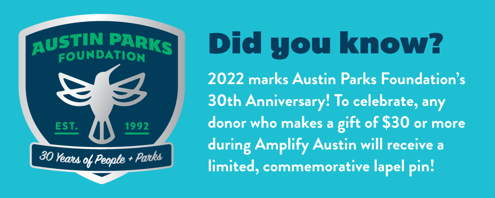 This year, Austin Parks Foundation celebrates 30 years of enhancing people’s lives by improving our city’s public parks, trails and green spaces. As we celebrate three decades of connecting people and parks, we need your help to continue our work!