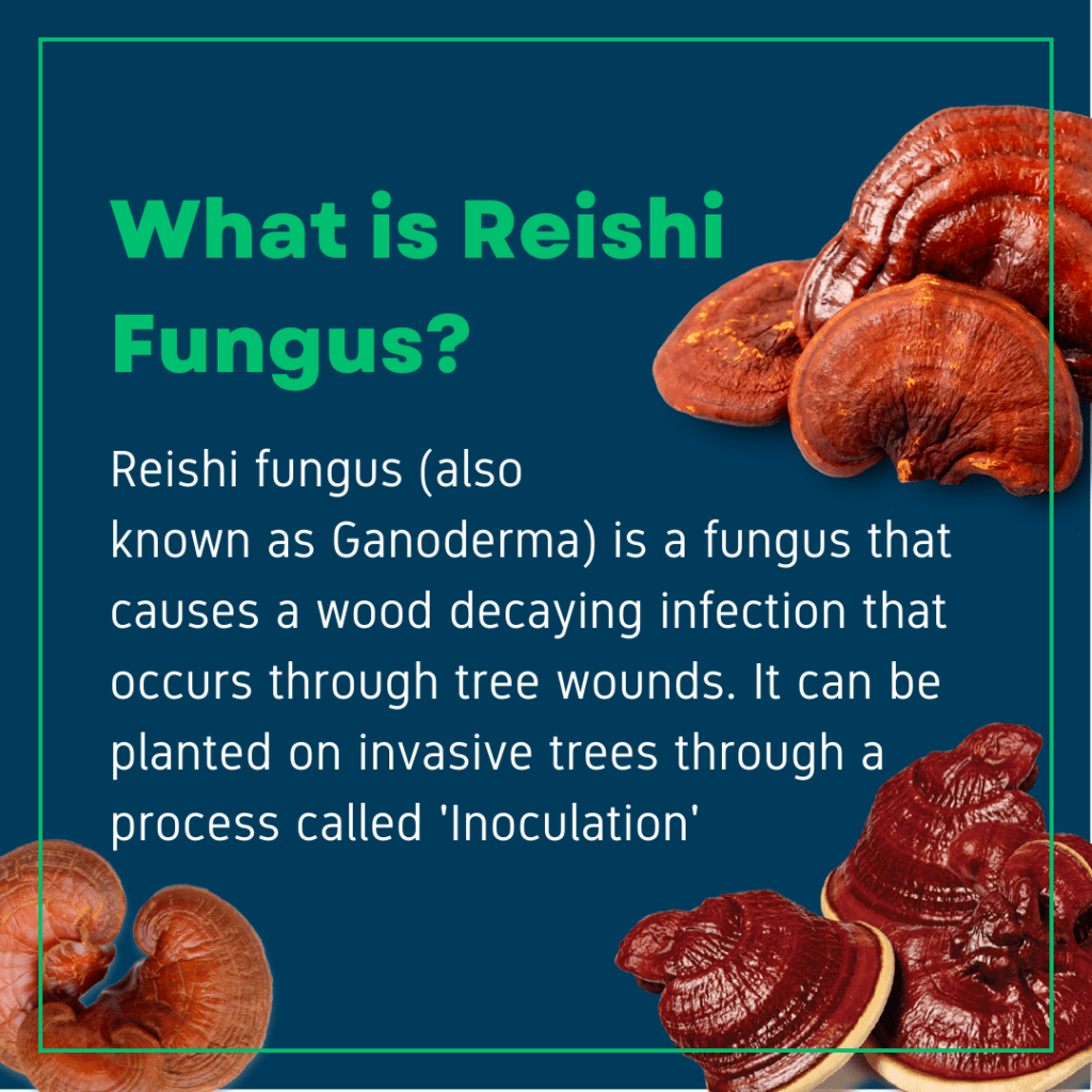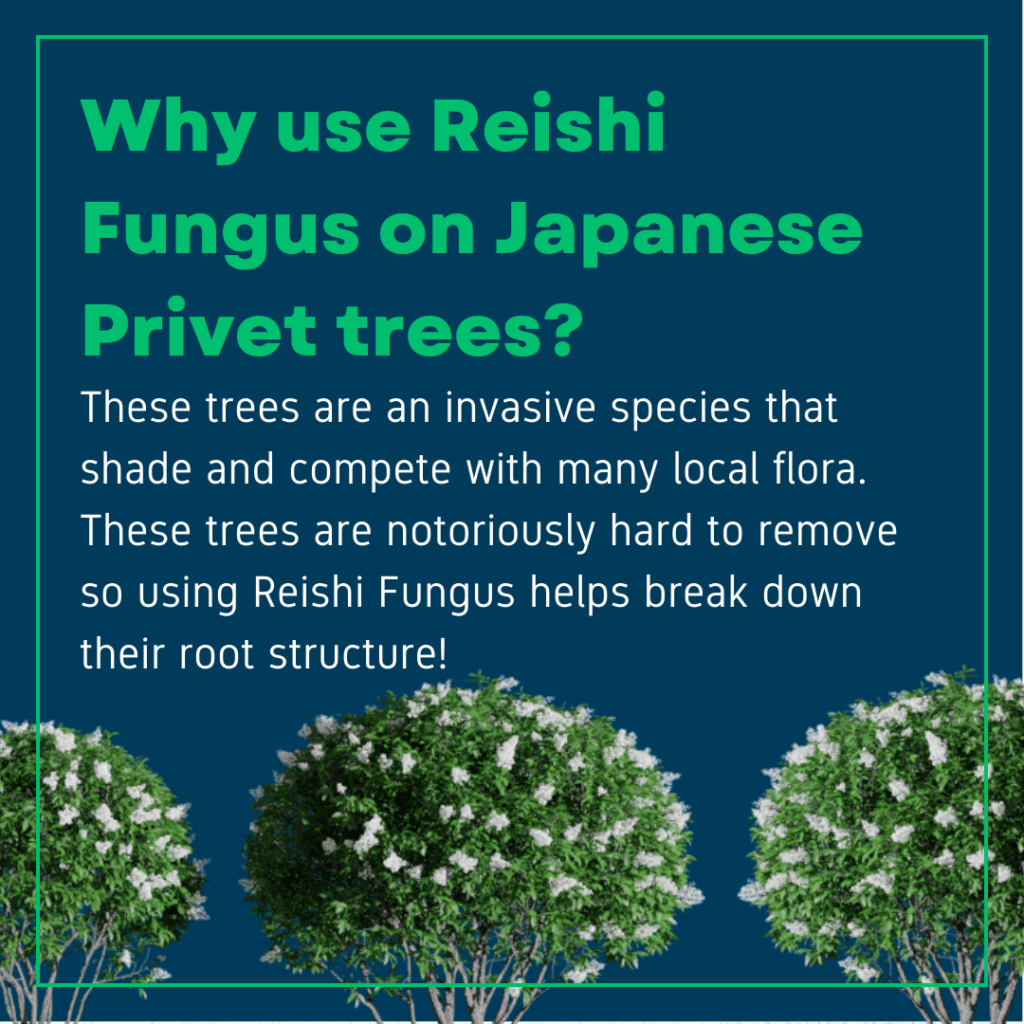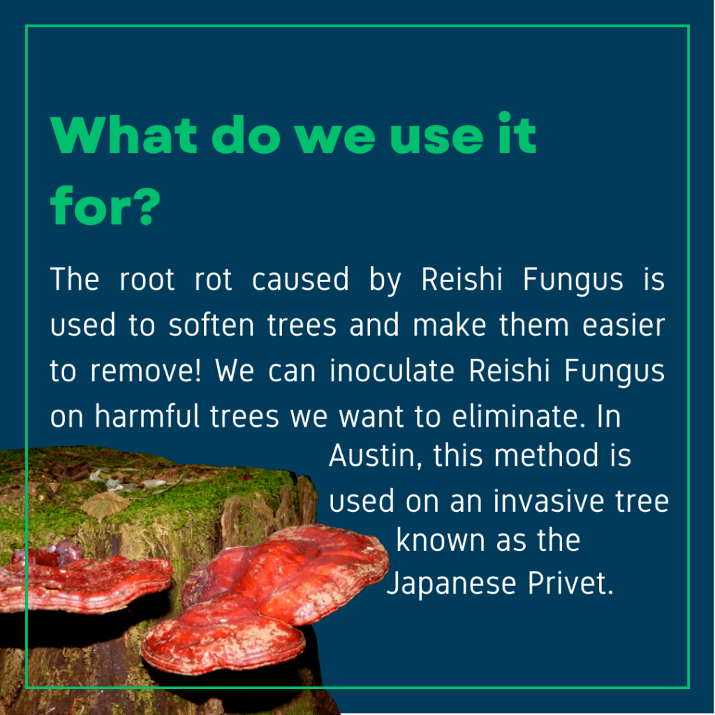 Reishi Fungus is a great tool for weakening trees before removing them, especially trees invasive to the Austin ecosystem! The invasive species, Japanese Privet, out competes other native plants like bushes and trees. Its fast growth also contributes to wildfires.