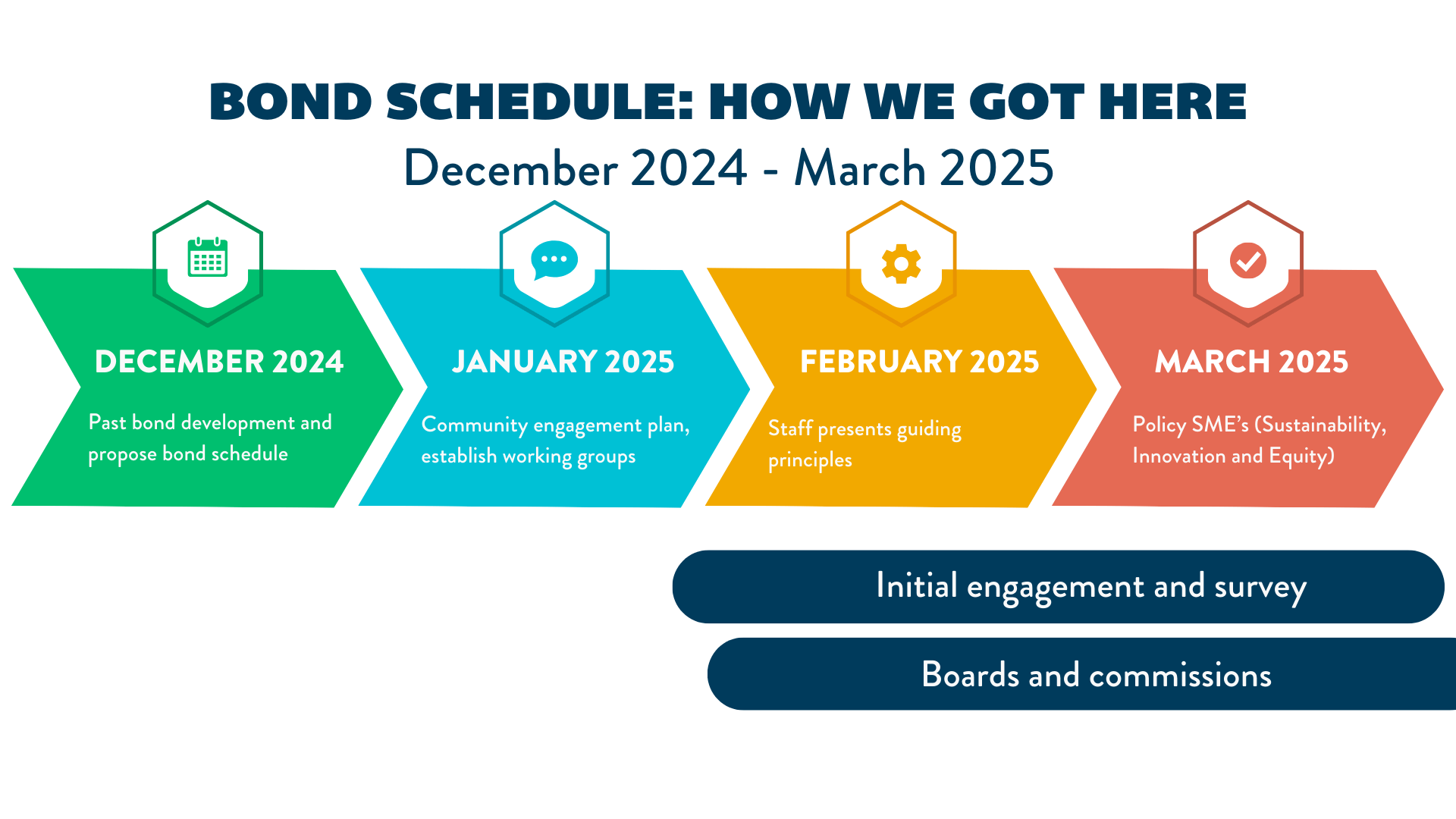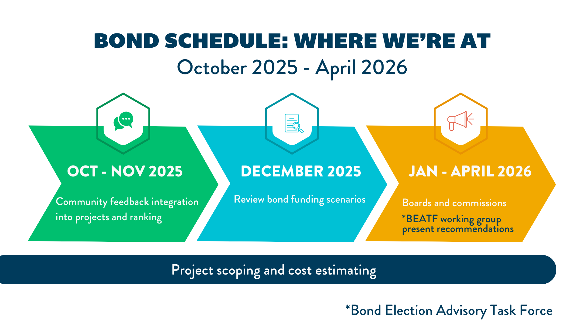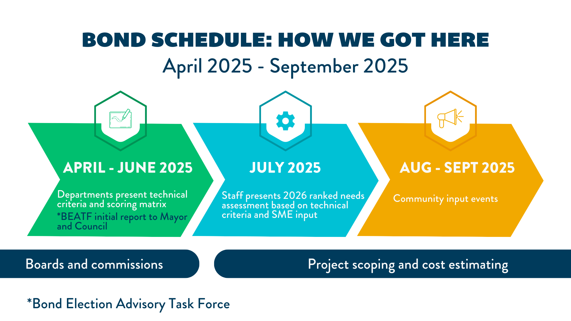On August 29, 2024, City Council approved Resolution 20240829-138, which established the Bond Election Advisory Task Force (BEATF). A Bond Election Advisory Task Force is established to identify and prioritize bond funding for projects that will address infrastructure needs including climate investment opportunities necessary to implement a comprehensive climate implementation program. The Task Force is composed of 22 members: two appointees by each Council Office. The BEATF recommended a 2026 Bond Election. City staff developed an Infrastructure Needs Inventory list. Once the City’s Needs Inventory is ranked and prioritized, a recommended list of capital projects is vetted through the Bond Election Advisory Task Force before finalizing and presenting to City Council.