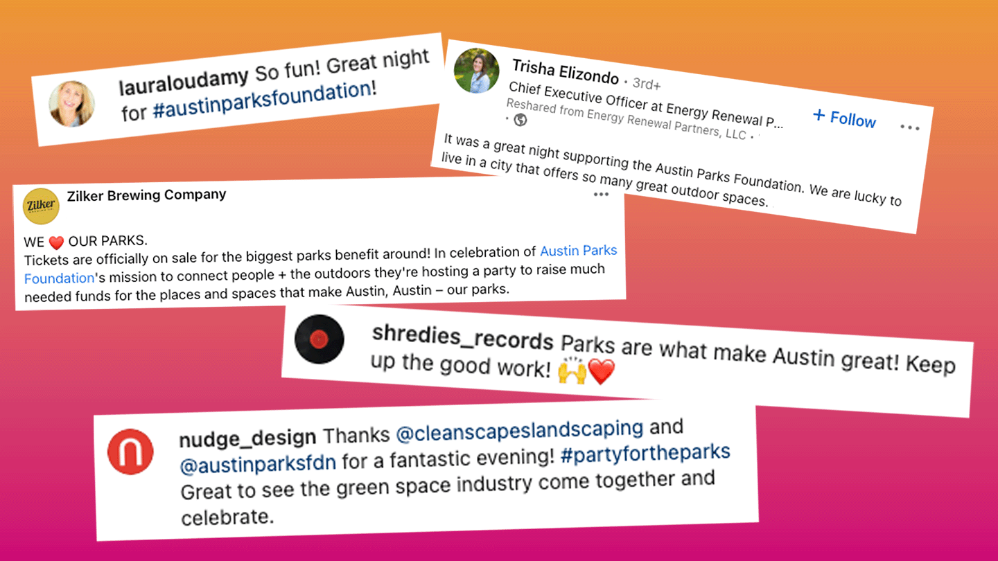 As much as this is a party, the heart of this event is to give back to our city’s parks. With events such as Party for the Parks we are able to continue our mission to enhance people’s lives by making our public parks, trails and green spaces better through volunteerism, innovative programming, advocacy and financial support. In collaboration with people, organizations, leaders, communities, businesses, neighborhoods and more, we are able to ensure equitable access to green spaces. So, THANK YOU for allowing us to improve nearly every park in Austin over the last 30 years.